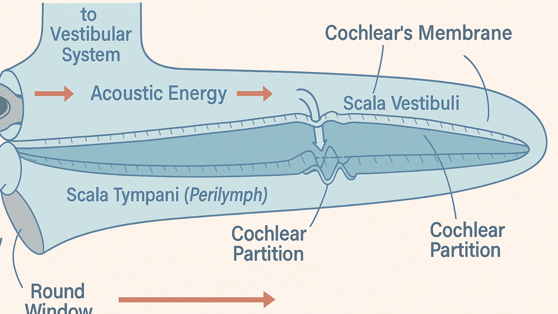 Hinter dem ovalen Fenster beginnt die Cochlea – eine spiralig aufgerollte, flüssigkeitsgefüllte Struktur. Sie zerlegt komplexe Schallmuster in einzelne Frequenzen. Hohe Töne aktivieren die Basis der Basilarmembran, tiefe deren Apex. Diese räumliche Sortierung heißt Tonotopie.