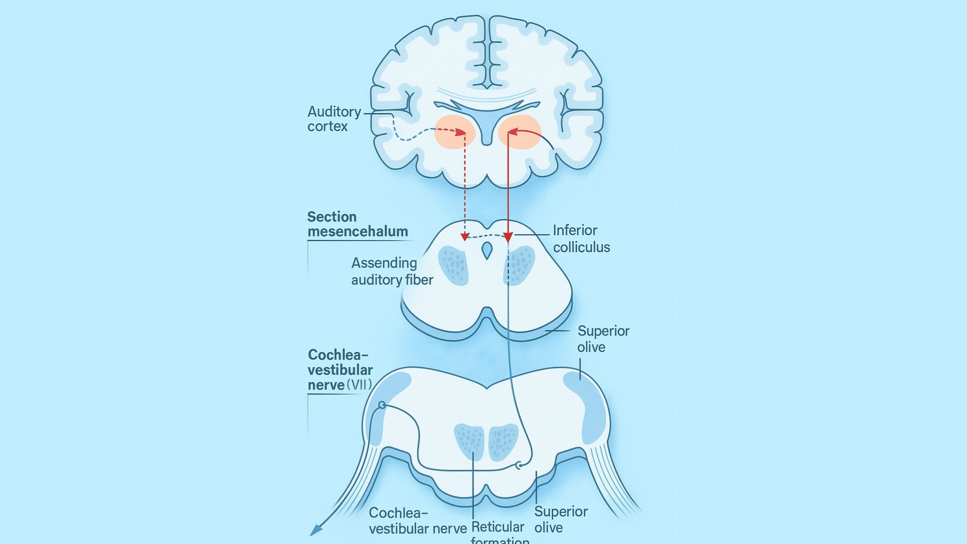 Die Nervenimpulse erreichen den Nucleus cochlearis im Hirnstamm, wandern über die obere Olive und den Colliculus inferior zum Thalamus. Erst im auditorischen Cortex entsteht bewusste Wahrnehmung – Klang wird erkannt, Sprache verstanden, Musik empfunden.